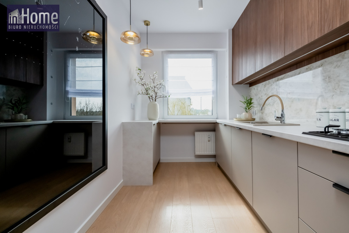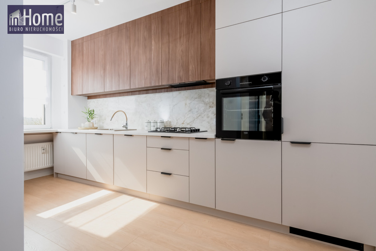W pełni wyposażona kuchnia - nowoczesne szafki, sprzęt AGD (piekarnik, kuchenka gazowa, zmywarka, pralko-suszarka) - gotowa do użycia.