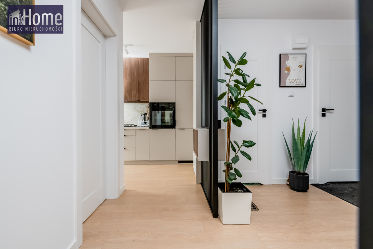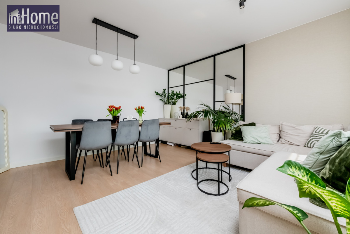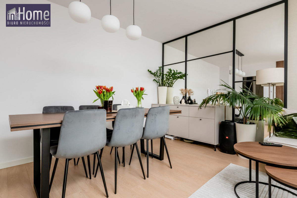 Funkcjonalny układ - przestronny salon połączony z jadalnią wyposażony w meble, osobna kuchnia i dwie sypialnie, idealne dla osób szukających komfortu i wygody.