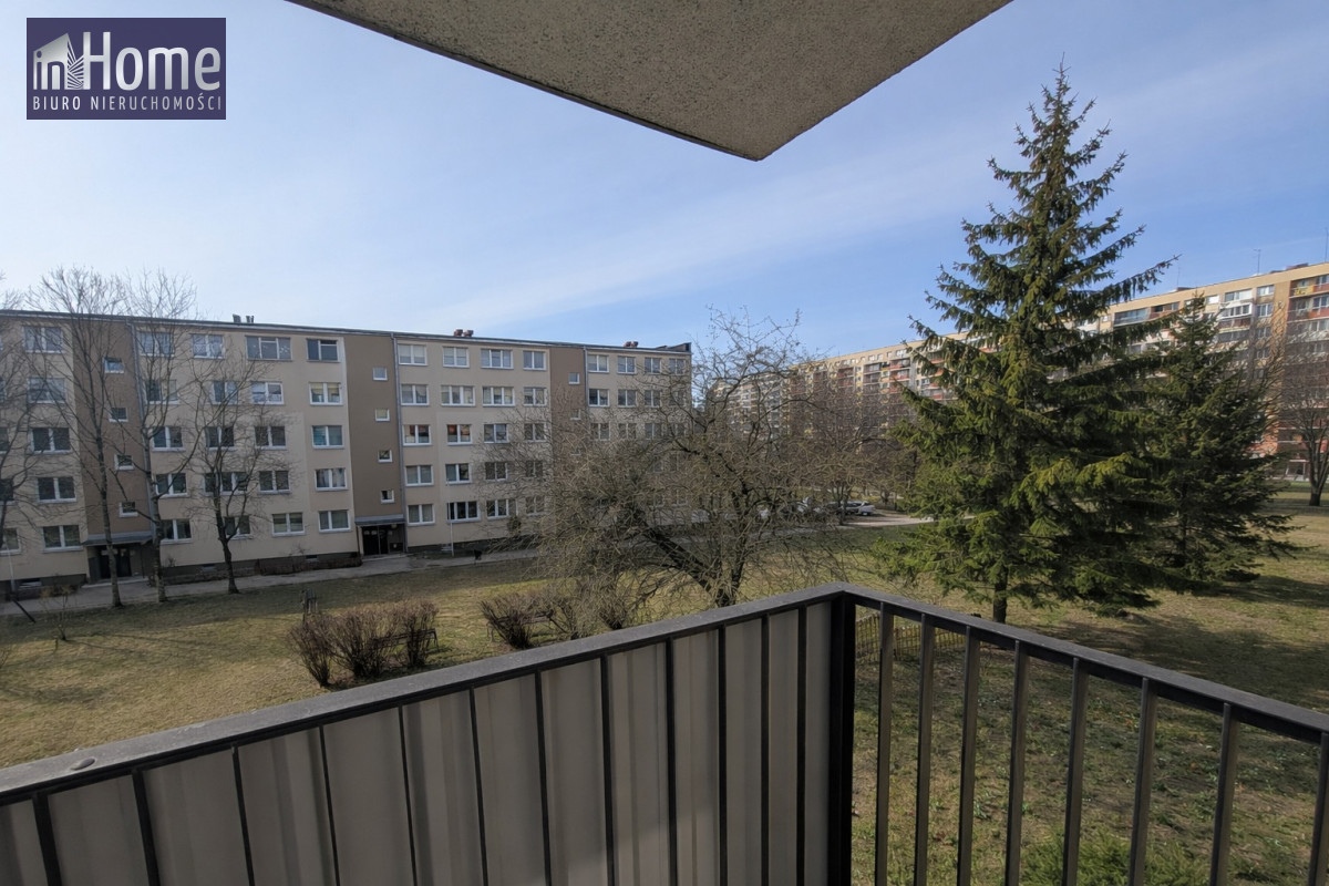 • balkon z widokiem na zieleń między blokami